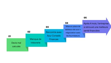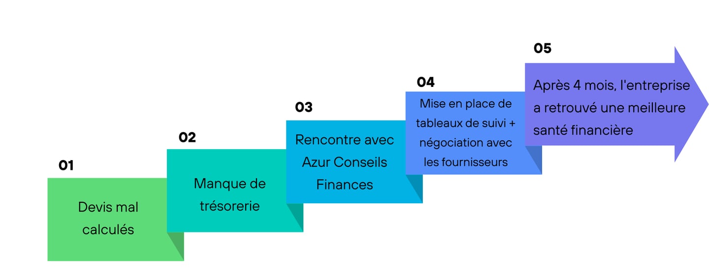 Actions mises en place : Prise de contact auprès de la Banque de France pour demander la suppression de l'inscription empêchant l'entreprise de contracter un nouveau prêt pour investir dans un local, création de tableaux de bords permettant une visibilité sur les recettes et dépenses à venir, mise en place d'un découvert autorisé.